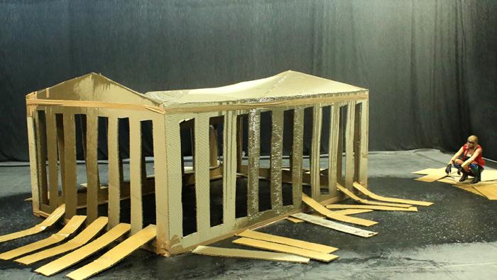 Seule en scène, Phia Ménard trace, taille, plie et scotche les parcelles d’une maison. Telle la déesse Athéna, elle édifie la « Maison Mère » de notre civilisation : un Parthénon de 150 kilos de carton. Mais au-dessus d’elle, un nuage menace. Soudain, une pluie diluvienne s’abat sur le plateau, balayant tout sur son passage ! La performeuse détrempée n’a d’autre choix que de reprendre sa construction, encore et encore.