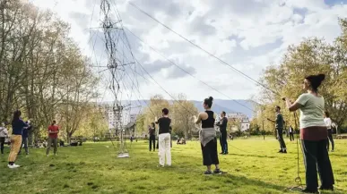Construction d’une grande tour de 12m de haut, assemblée puis manipulée par 25 personnes, en direct avec les participants et devant des spectateurs.