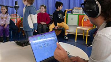 Des élèves de l’école maternelle Gros Caillou (4e) prêtent leur voix à l’œuvre "Lumières pour tous. Les projecteurs même."